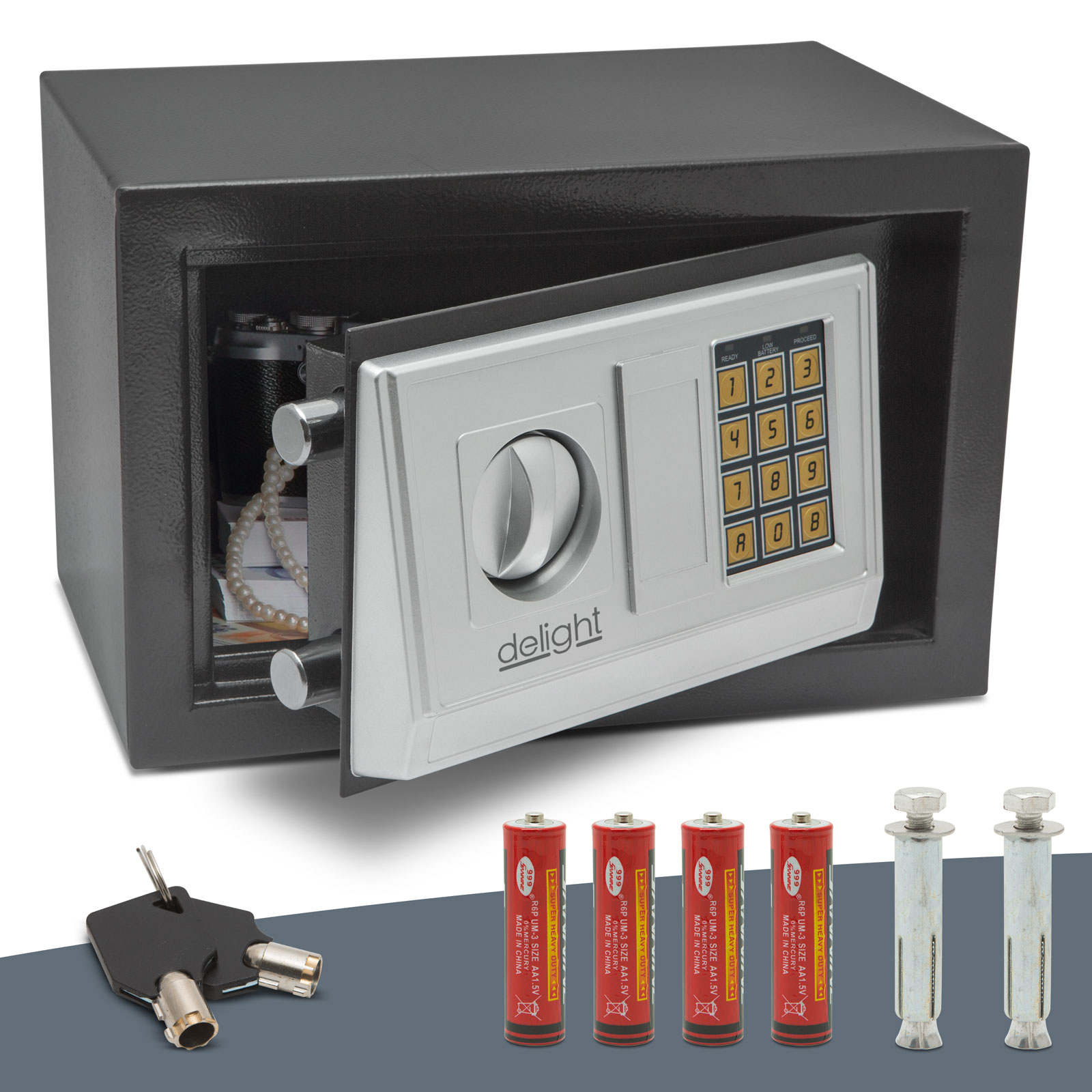 Ofera siguranta deplina pt. depozitarea bijuteriilor, banilor, sau actelor importante. Obiectele pretioase sunt pazite de un sistem digital deosebit de sigur – al carui cod PIN este stiut doar de catre Dvs. Codul PIN se compune din 3 pana la 8 cifre, alese de Dvs. In caz de nevoie, codul PIN poate fi modificat oricand – tot de catre Dvs. In cazul uitarii codului PIN, acesta poate fi deschis doar cu ajutorul cheii mecanice Master, accesoriu al seifului. Cheia master este recomandabil de a fi pastrat in alta locatie, de cat cea a seifului.
